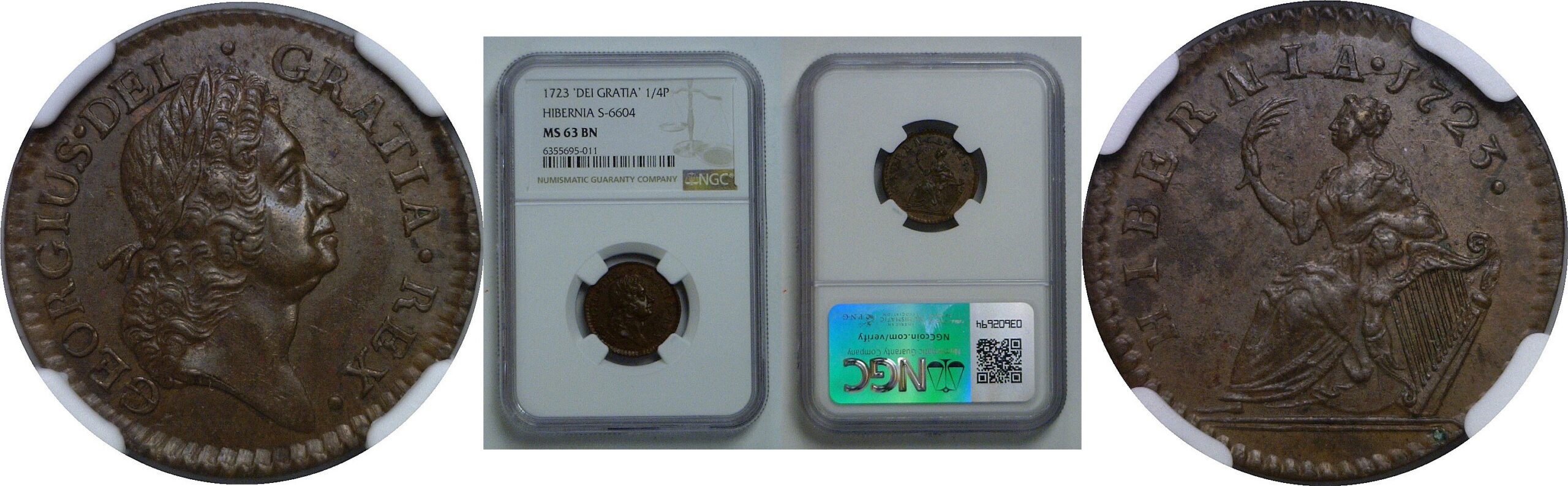 1723 Hibernia Farthing DEI GRATIA NGC MS-63 BN