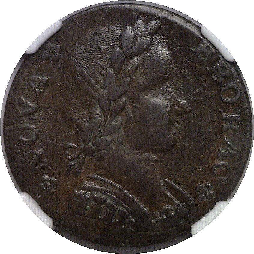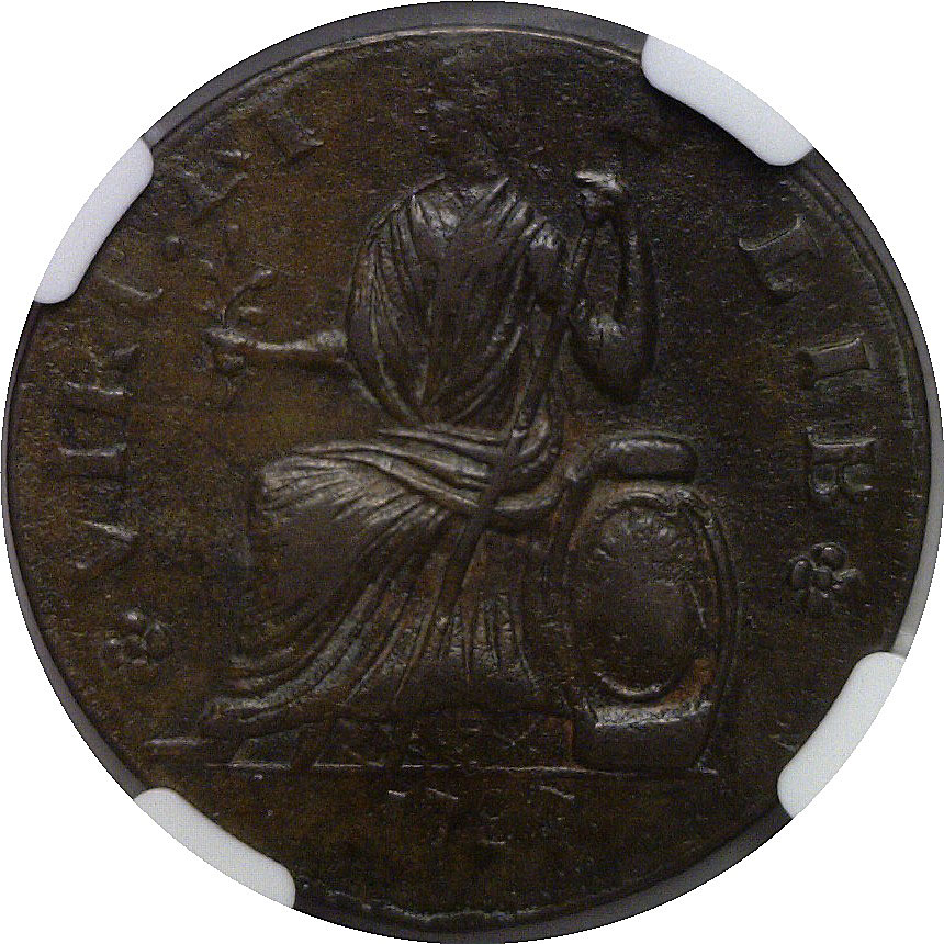 A well-preserved example that exhibits strong detail with only the slightest rub on the high points. The surfaces are smooth and attractive, displaying rich, even brown coloration with glossy underlying luster. The portrait and seated reverse figure are boldly defined, contributing to the coin’s pleasing overall eye appeal. A scarce and desirable colonial issue that is approaching Mint State.