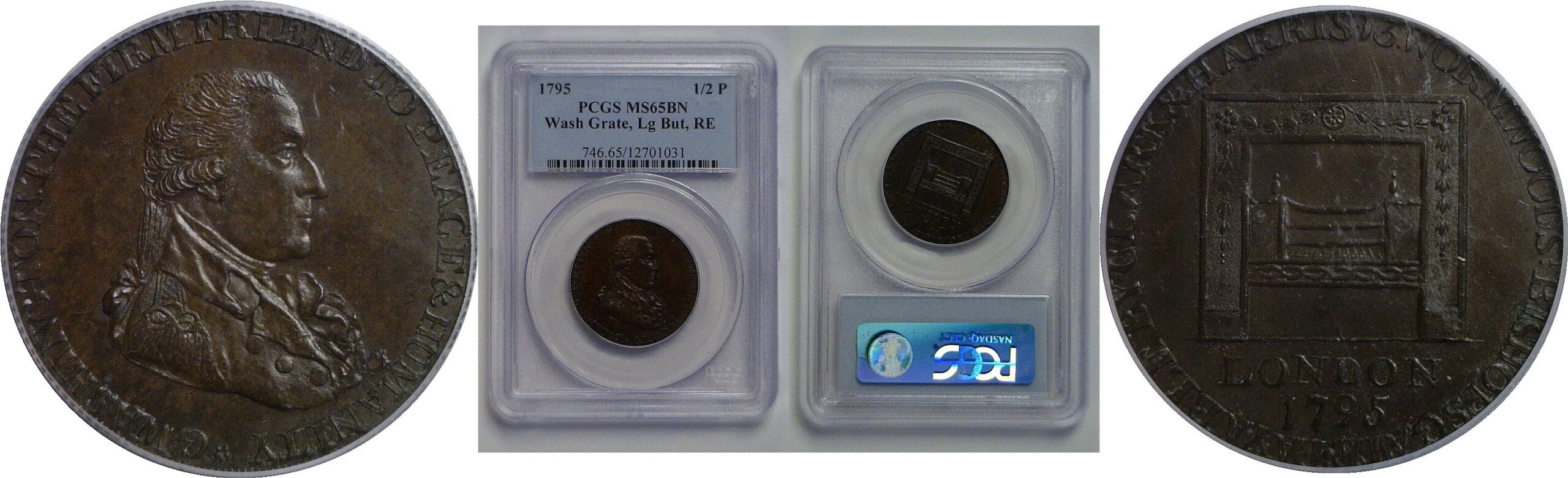 A superb Gem Brown example of the popular Washington Grate Halfpenny, featuring the Large Buttons obverse and Reeded Edge variety. This piece displays exceptionally smooth, glossy chocolate-brown surfaces with sharp portrait detail and crisp legends surrounding Washington’s bust. The reverse grate design is fully defined with excellent line detail and virtually no evidence of handling. Outstanding preservation with gorgeous surfaces and superior eye appeal!
