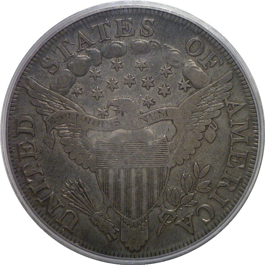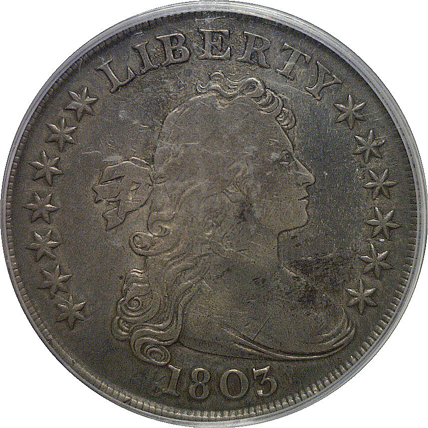 Large 3. A pleasing, problem-free example of the final-year Draped Bust dollar. Both sides retain strong, well-defined devices and the surfaces exhibit a medium-gray patina with darker steel and charcoal highlights, lending the coin an attractive, original appearance. Minor scattered marks are typical for the issue and do not detract from overall eye appeal.