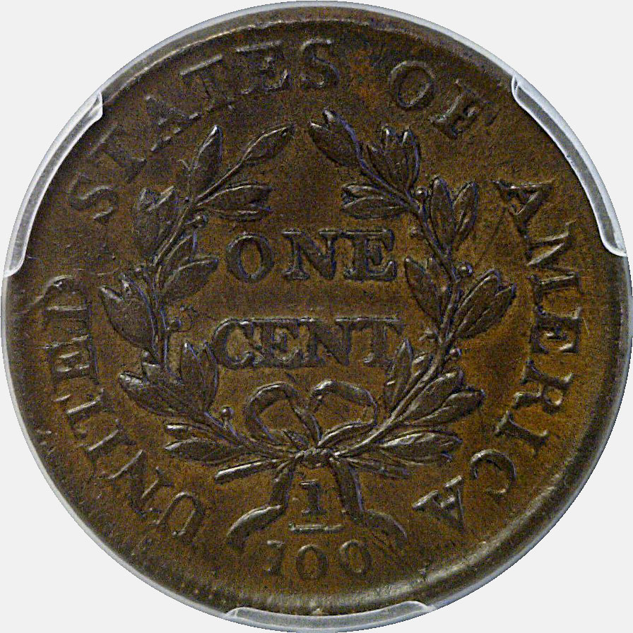 Small Date, Large Fraction. S-258. Well detailed with choice surfaces that are problem-free and retain a fair amount of mint luster. The obverse is a light reddish-brown while the reverse is medium brown. An arcing die crack at the lower left of the obverse field is diagnostic of the variety.