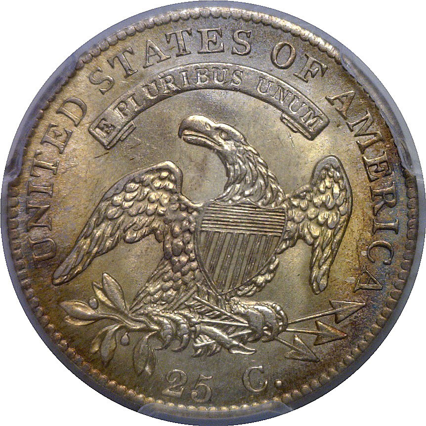 Browning 3, Medium 0. A sharply struck near-Gem with excellent detail in the curls and eagle. Lustrous surfaces show light, even silver-gray toning with attractive golden highlights, and only minor marks consistent with the grade. A very appealing, high-end example of this early quarter type.