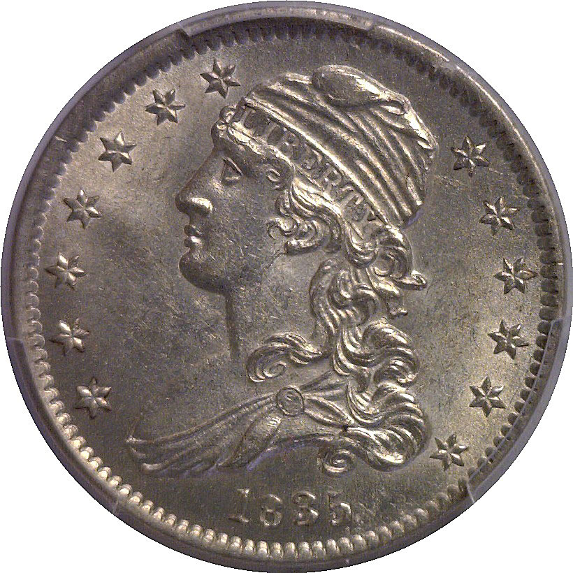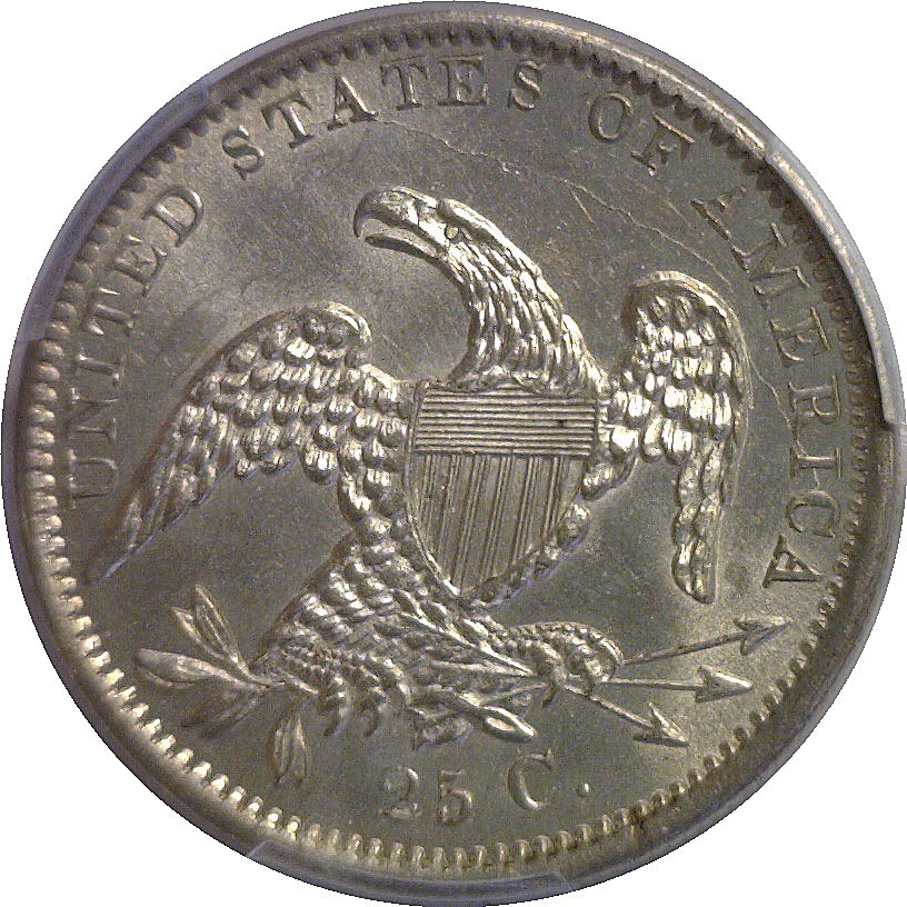 An attractive early quarter with crisp white luster and a sharp strike. The surfaces are choice and display minimal marks, consistent with the grade.