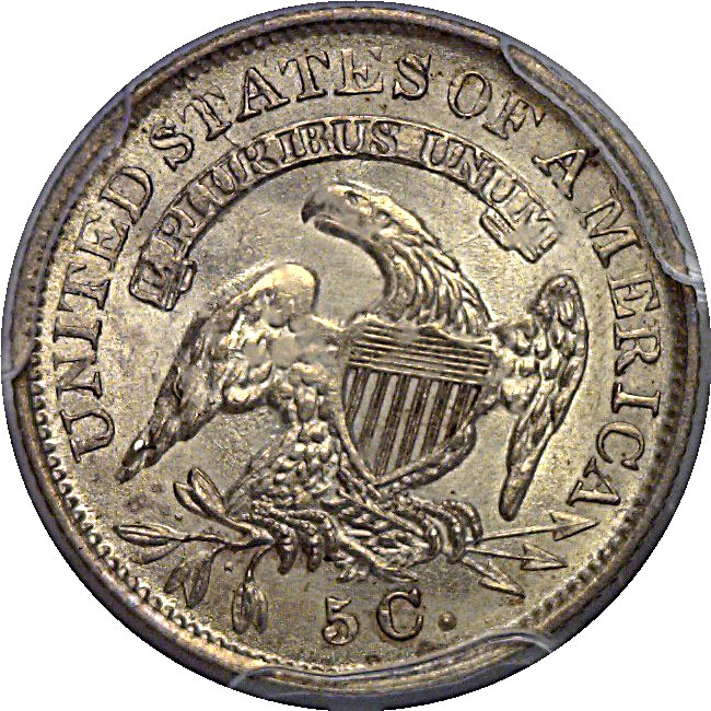 Small 5c. An attractive survivor from the final year of the Capped Bust half dime series. This example offers satiny luster with light silver-gray brilliance and subtle golden highlights at the rims. The strike is sharp, showing fine detail in Liberty’s curls and cap, as well as the eagle’s feathers and shield lines. Surfaces are pleasingly preserved for the grade, with no distracting marks and good overall eye appeal.