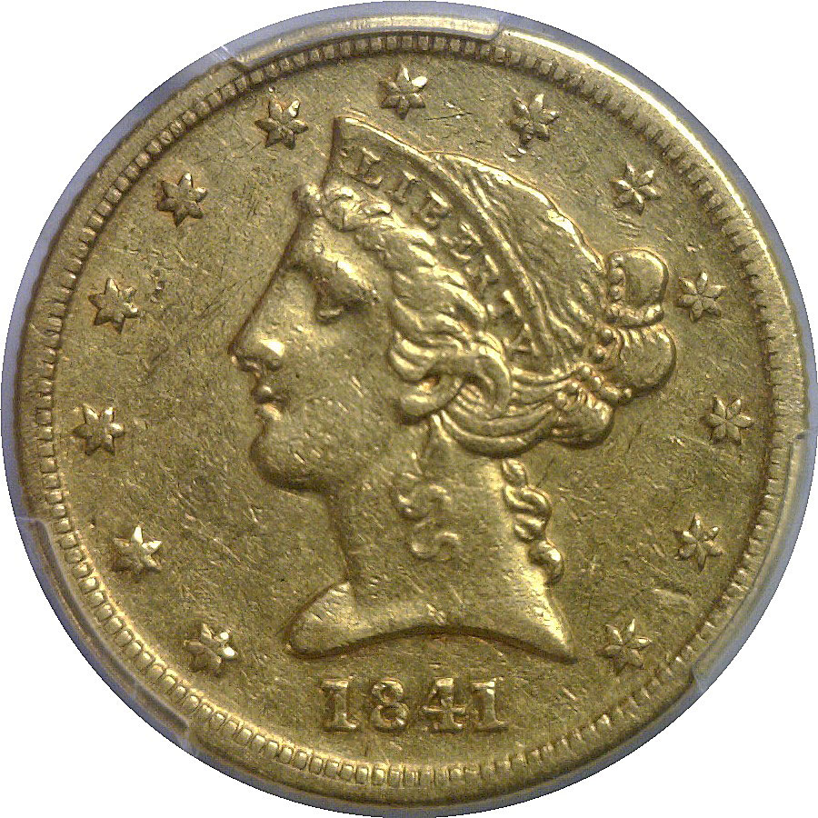 Small D. A very attractive Dahlonega ‘Five’ with solid detail and nice problem-free yellow-gold surfaces.