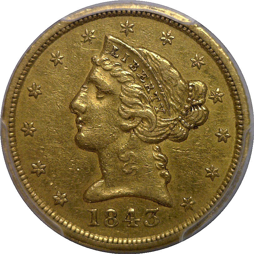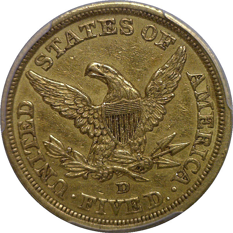 Medium D. This lightly circulated, scarce Dahlonega-minted Half Eagle, retains pleasing original gold color with warm olive-gold accents throughout. The strike is solid for the issue, with clear definition in Liberty’s hair curls and coronet, while the reverse eagle shows strong detail in the wings and shield. The surfaces are smooth with only minor marks and the eye appeal is excellent.