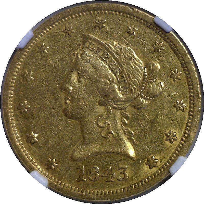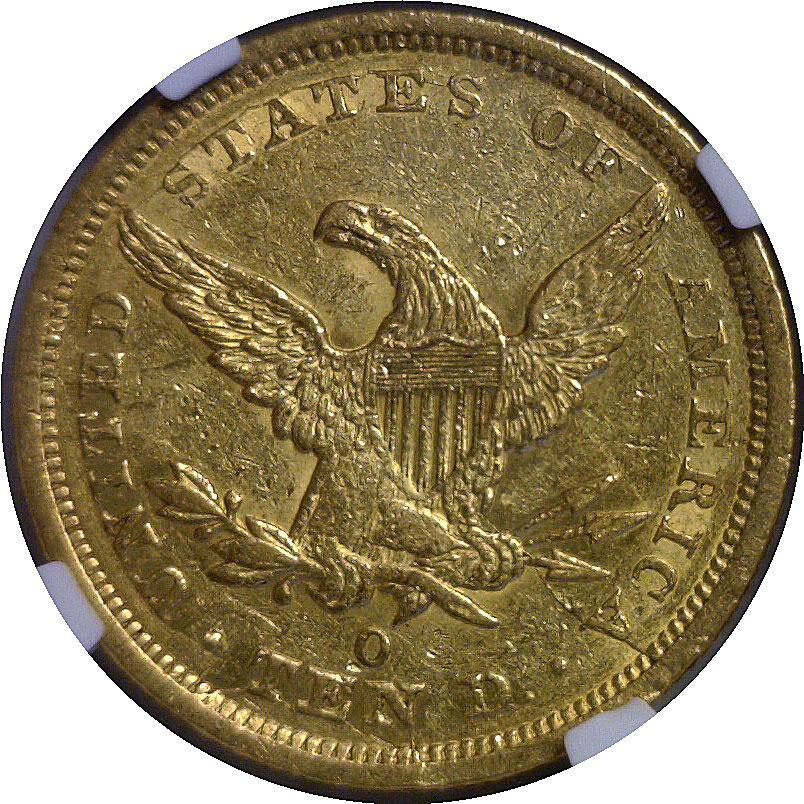 A pleasing example of this better early New Orleans ‘Ten’ with antique gold surfaces and underlying luster.