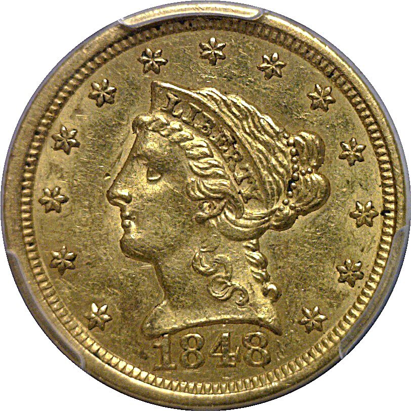 This rarity is one of the most historically significant coins in American Numismatics. 1,389 pieces were struck from the first shipment of gold received from California after James Marshall discovered gold at Sutter’s Mill on January 24, 1848. “CAL.” was counterstamped on the reverse to signify this fact. They are considered by many numismatists to be our nation’s first commemorative. Survivors are scarce as fewer than 150 are accounted for and their appearance on the market is rare as this is one of the most desirable of all U.S. coins. This is a very attractive Borderline Unc. with bold detail, little sign of ‘rub’ and choice lustrous surfaces. The surfaces are original and the overall appearance and eye appeal are outstanding!