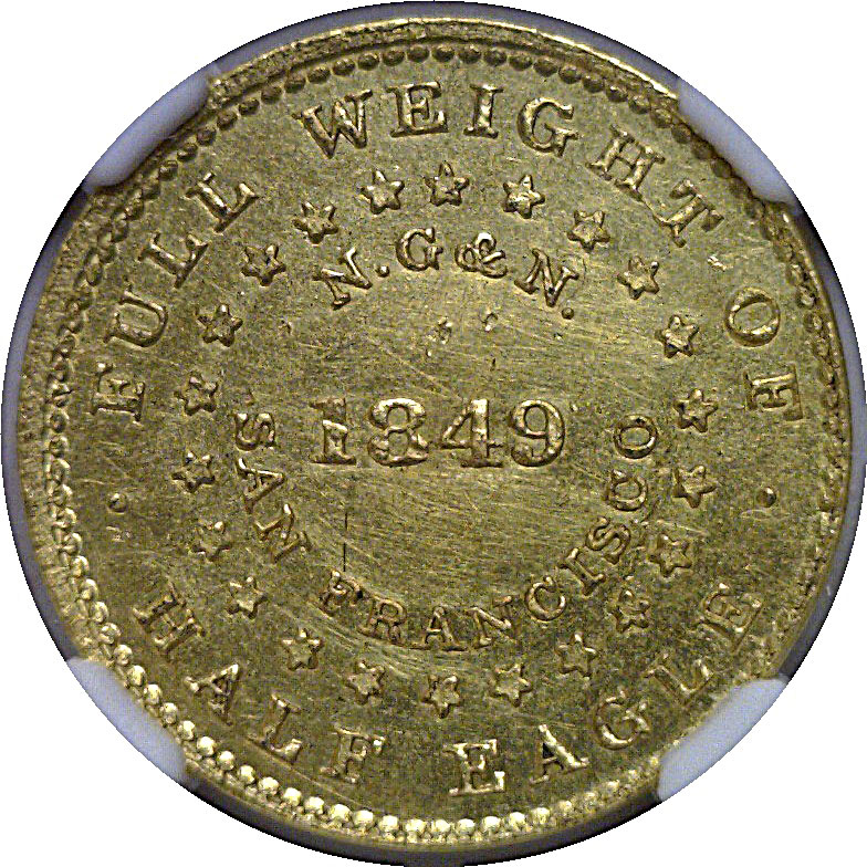 Plain Edge. The first coiner’s name to appear in California newspapers was Norris, Gregg & Norris and they were very probably the first private company to issue gold in California. These half eagles were struck from 100% California Gold in May of 1849. The present example is sharply struck with semi proof-like fields and has the greenish-gold color of California mined gold. The eagle on the reverse is exceptionally sharp and the eye appeal is outstanding!