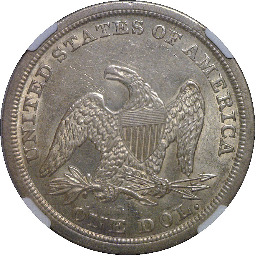 A desirable early No Motto Seated Liberty dollar, this example offers strong eye appeal with light, even wear and substantial remaining mint luster. The strike is sharp, with well-defined detail in Liberty’s figure and the reverse eagle. The surfaces are pleasing and show only minor marks consistent with the grade.