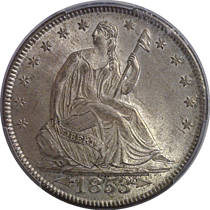 Arrows and Rays. Intense silver-gray luster flows over very sharply struck surfaces and displays excellent eye appeal. Marks are trivial and few. Arrows and rays were added to the existing design in 1853 to denote a reduction in silver content. The following year, the rays were eliminated but the arrows remained. The result was this popular one-year type.