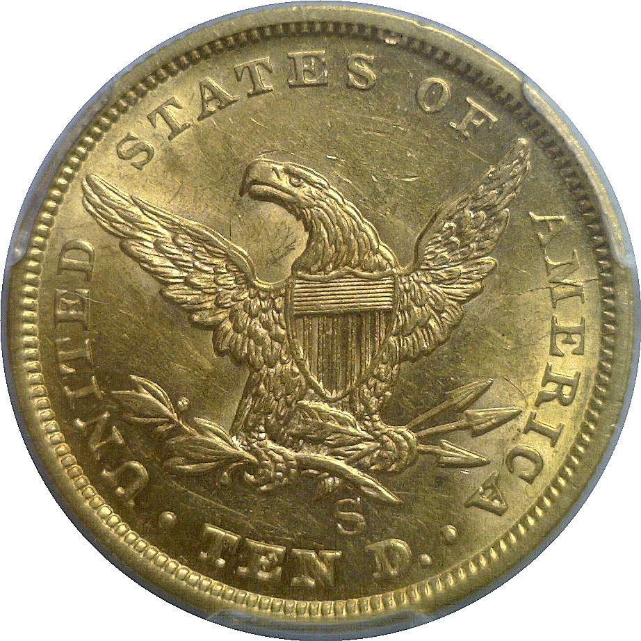 A scarce early San Francisco issue with strong remaining luster and attractive original gold color. Light friction is evident on the high points, yet much mint bloom persists. Liberty’s portrait is well defined, and the reverse eagle shows bold feather detail with sharp legends. A pleasing near-Mint State example of this desirable Gold Rush-era Ten Dollar piece.