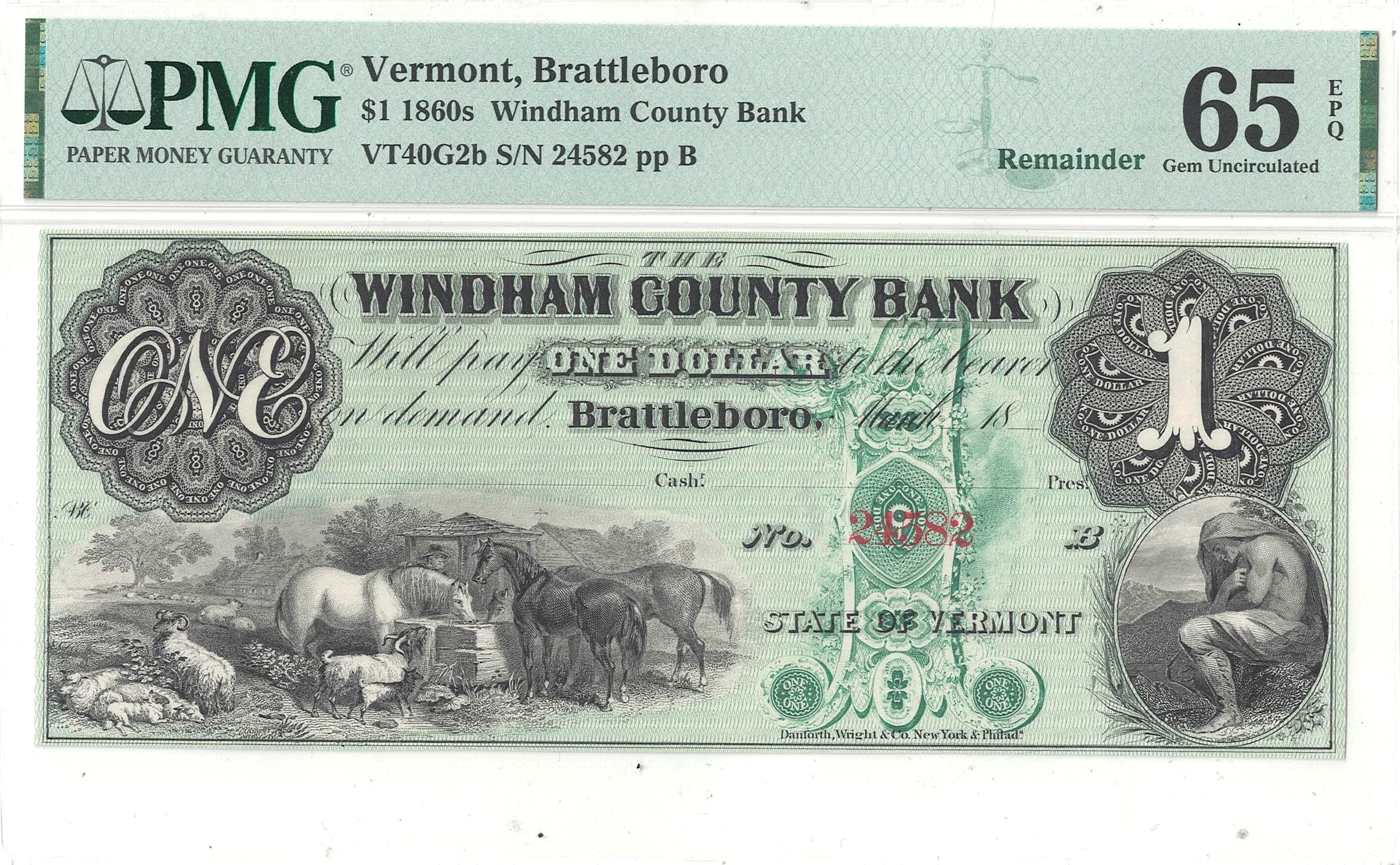 Remainder. Windham County Bank. Strong black and green inks blend well onto premium white paper. Vignettes include horses at left drinking from trough and a seated man may be observed at right. Fantastic eye appeal!