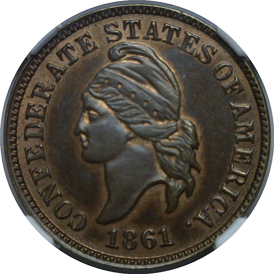 CAC. An incredible piece of Confederate history. Robert Lovett engraved and struck Confederate Cents in 1861 of which 13-16 are known. He then sold the dies to John Haseltine and J. Colvin Randall who struck 55 copper coins before the dies broke. This is one of the better surviving examples with glossy brown and mahogany surfaces with underlying reddish highlights. Sharply struck with excellent detail in Liberty’s hair and the wreath, it stands as a premium representative of this enigmatic issue.