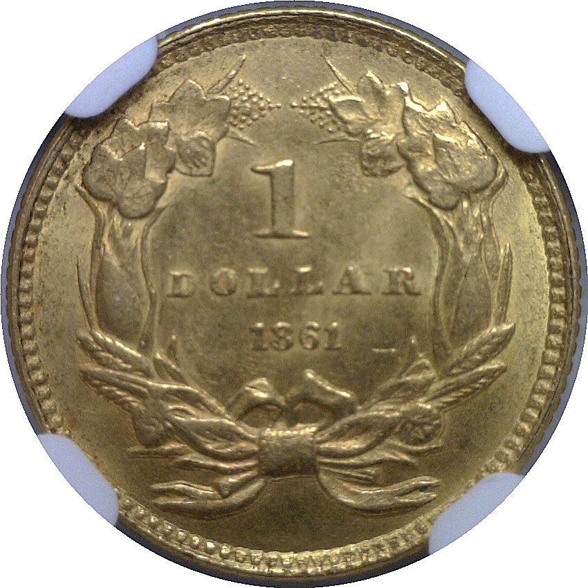 Pleasing yellow-gold example with satiny luster and solid overall eye appeal. Well-struck for the type, with clear detail in the portrait and wreath. Light, scattered marks are consistent with the grade. An attractive Civil War–era issue.