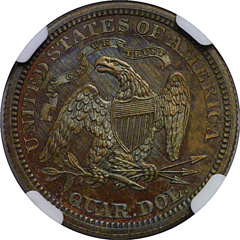 R-7. A transitional pattern with the reverse of 1866, which added IN GOD WE TRUST, paired with the regular issue 1865 obverse. Struck in copper with a reeded edge. This is a gorgeous example with choice brown surfaces highlighted by bright blue overtones.