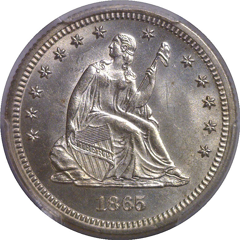This dazzling 1865 Seated Liberty quarter, a scarce date with just 58,800 struck during the final year of the Civil War, carries both historical significance and wonderful eye appeal. The obverse is sharply struck with frosty luster and crisp details in her gown and the surrounding stars. The reverse eagle exhibits bold feather definition and brilliant mint luster. High grade survivors are elusive with just 6 coins grading finer at PCGS.