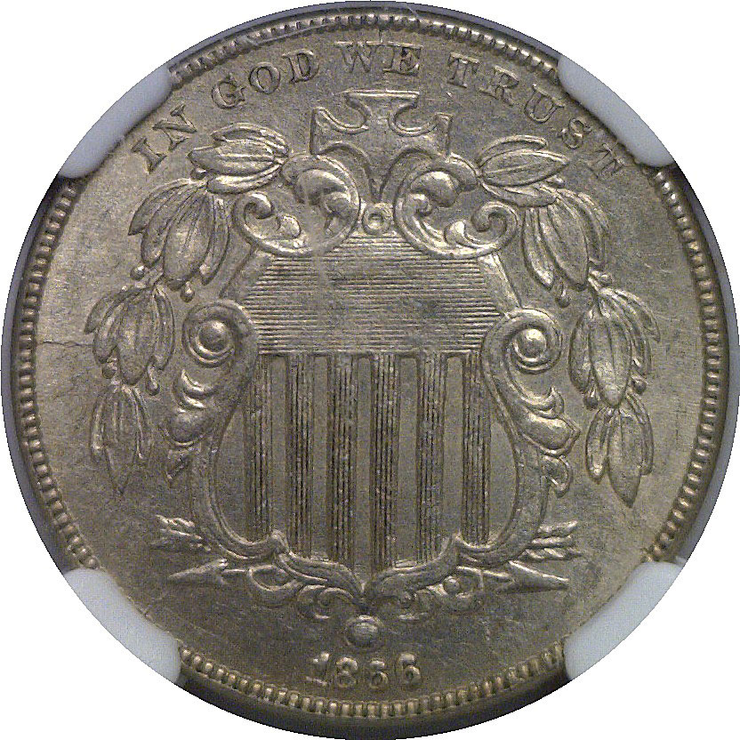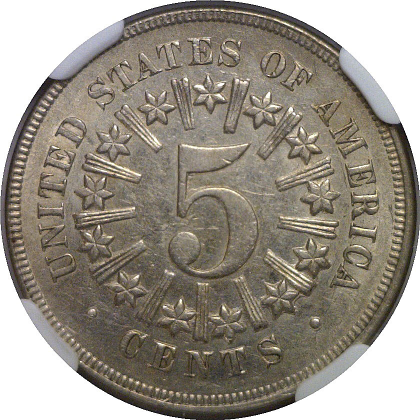 A pleasing Mint State example of the first-year Shield nickel. Bright silver-gray surfaces display strong mint luster with well-defined shield detail and bold rays on the reverse.