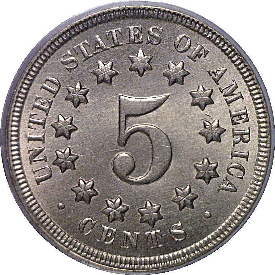 CAC. A Gem example displaying satiny silver-gray luster and sharp detail across the intricate shield, leaves, and star devices. The strike is crisp and even, with full definition of the central lines and lettering. The reverse shows bold relief in the numeral 5 and surrounding stars, set against a smooth, reflective surface that highlights the design.