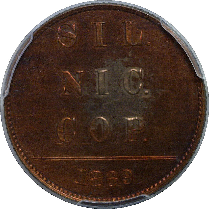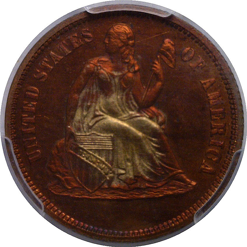 R-7. A richly colored and highly desirable copper pattern featuring the seated Liberty obverse paired with a bold “SIL. NIC. COP.” reverse, representing an experimental composition of silver, nickel, and copper. The surfaces display vibrant original red color with reflective fields and sharply struck design elements throughout. The center of both sides shows a bright golden circle which is a result of that alloy mix. The coin is well preserved and offers strong eye appeal, with smooth mirrored fields and crisp detail in Liberty’s drapery and shield, as well as fully defined reverse lettering. From the King Farouck “Palace Collection”, sold by Sotheby’s in February of 1954.