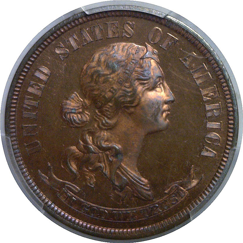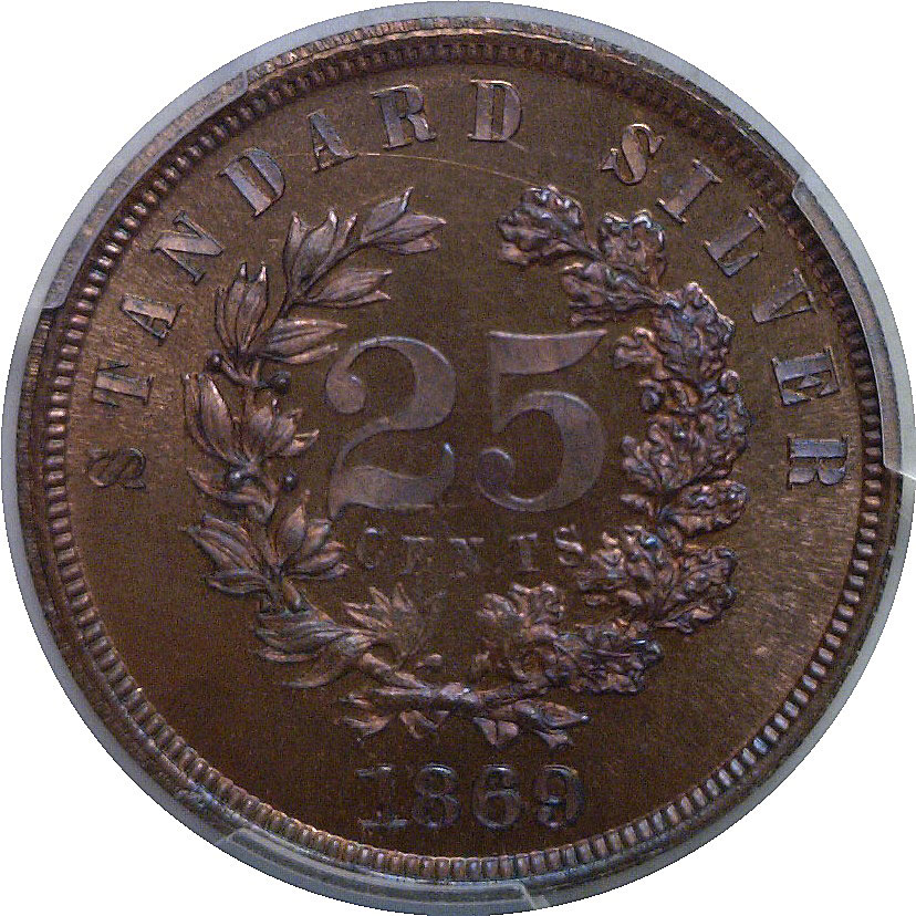 CAC. R-7. A right-facing Liberty wears a headband displaying LIBERTY and a single star at the front. UNITED STATES OF AMERICA borders above, with IN GOD WE TRUST in a curved ribbon below. The reverse shows STANDARD SILVER above, with 25 CENTS within a wreath. The date is below Struck in copper with a plain edge. Strikingly attractive with deep copper-red hues blanketing the reflective surfaces, which display strong mirrors and crisp, fully struck detail throughout Liberty’s portrait and the bold wreath reverse. The fields are notably clean for the grade, with minimal handling and excellent eye appeal.
