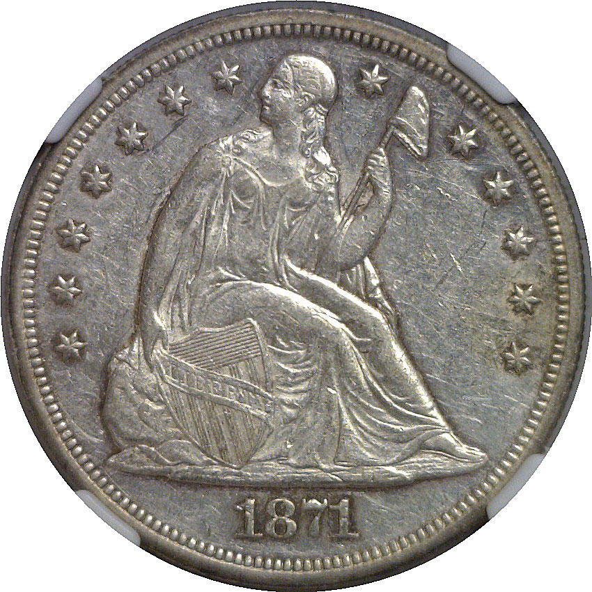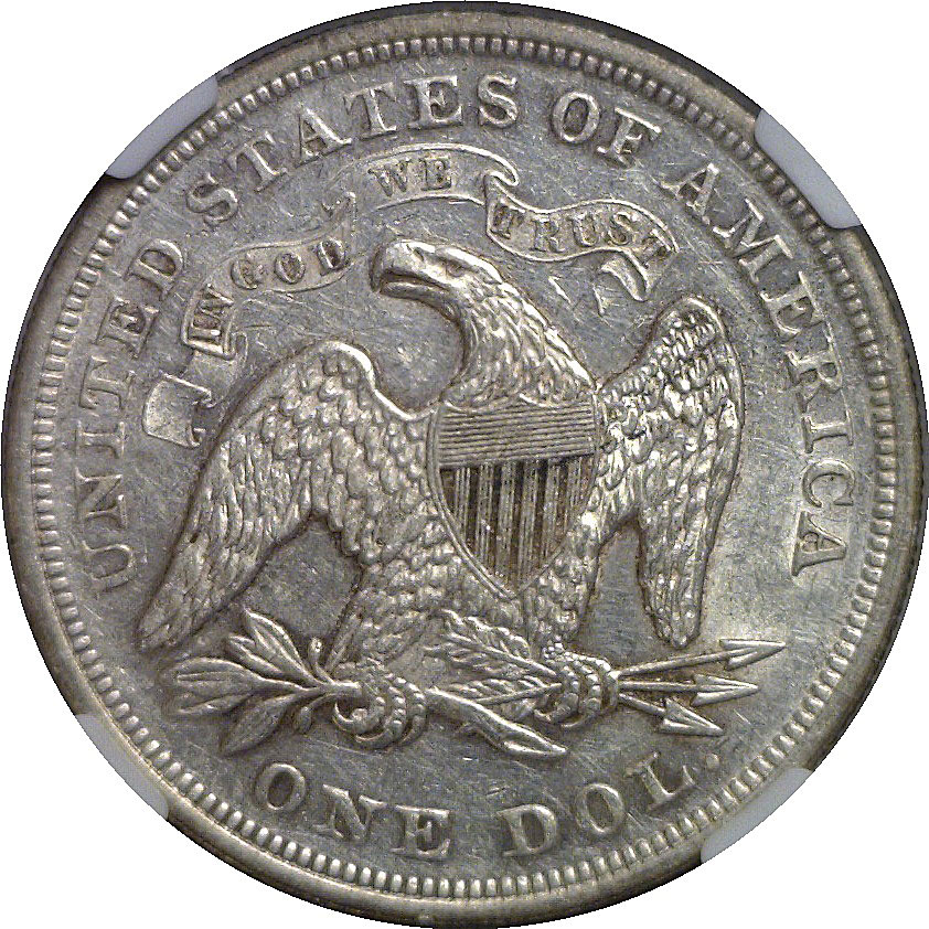 A desirable Seated Liberty Dollar that presents strong eye appeal and is very nearly Mint State. Liberty retains sharp definition in the head, shield, and flowing drapery, with only the lightest rub evident on the highest points. The reverse eagle is equally well preserved. Choice silver-gray surfaces are accented by flashy mint luster.