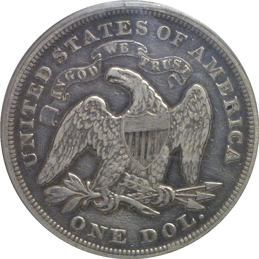 The major design elements remain well detailed, with Liberty’s figure, shield, and drapery clearly defined, and the eagle on the reverse bold with strong feather definition. The surfaces are smooth and problem-free, showing an attractive, original medium-gray patina with subtle darker accents in the protected areas. A wholesome, collector-friendly example. Old green label holder.