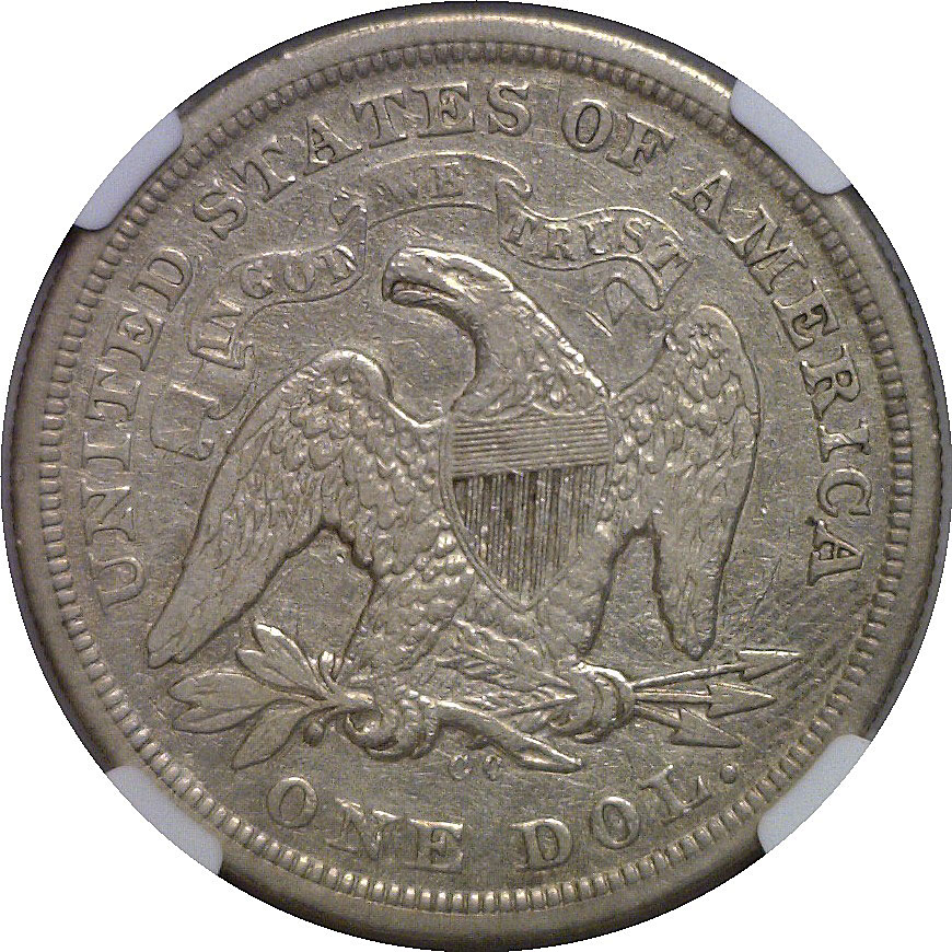 The rarest Carson City Seated Dollar, although the 1871-CC had a lower mintage. Just 2,300 of these 1873-CC dated coins were minted, but only 1,000 were released into circulation and an estimated 200 have survived. This is a very attractive example with moderate, even wear that defines the VF25 grade, with Liberty’s outline and major design elements remaining bold and easily discernible. The reverse eagle retains clear feather detail and a strong shield, while the surfaces on both sides show an attractive light silver-gray patina with minor circulation marks and a pleasing appearance.