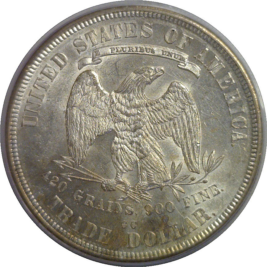 With only 509,000 pieces struck, most 1876-CC Trade Dollars saw extensive circulation in the Far East, making Mint State survivors scarce. This example displays bright satiny luster with soft silver-gray surfaces. The strike is unusually bold for the issue, showing sharp detail in Liberty’s gown folds and the eagle’s breast feathers. This coin’s vibrant luster and minimal marks for the grade give it strong visual appeal. Housed in an old green label holder.