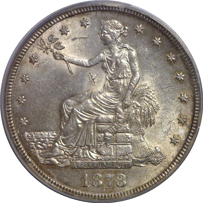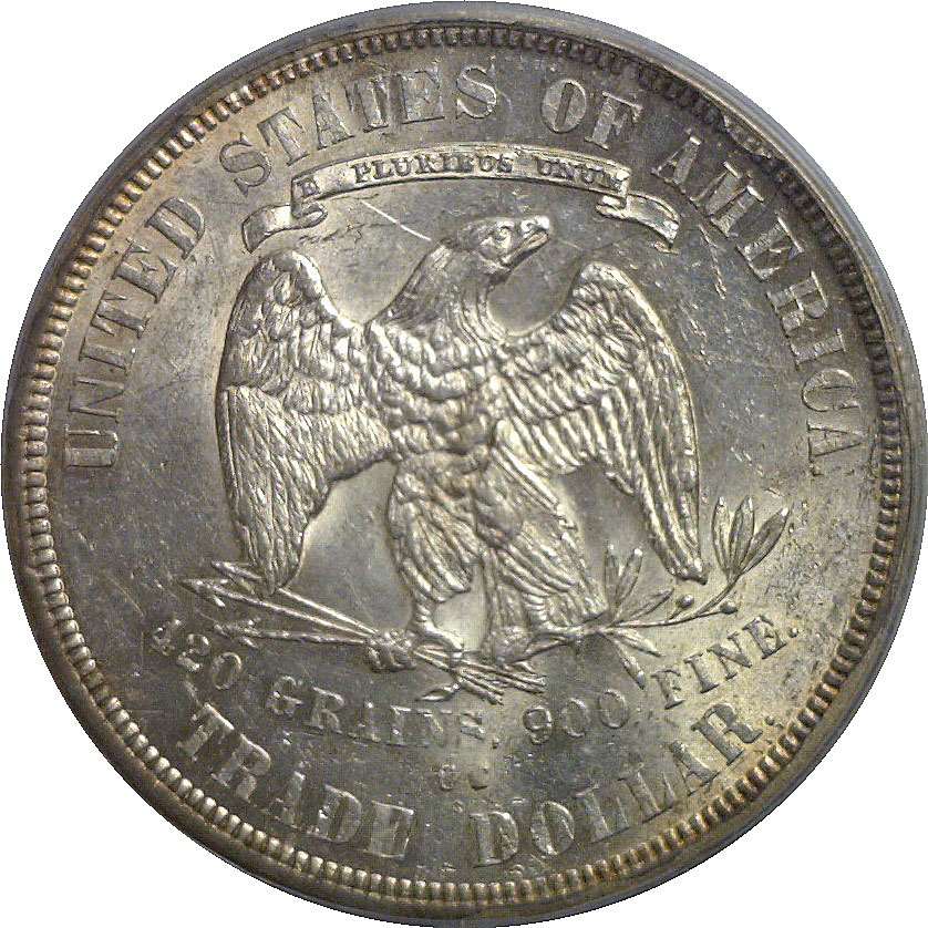 CAC. This scarce date is the only regular issue Trade Dollar with a mintage under 100,000. The present example displays a very sharp strike on both sides and bright lustrous original surfaces. Outstanding for the grade with just a few noticeable marks and strong eye appeal. Housed in an old green label holder.