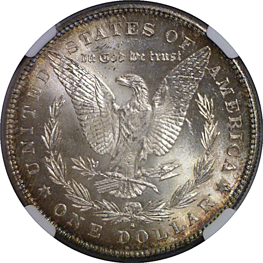 Reverse of 1878. Sharply struck with flashy mostly white luster and splashes of champagne-gold color primarily along the peripheral areas. The design elements are frosted and the eye appeal is outstanding!