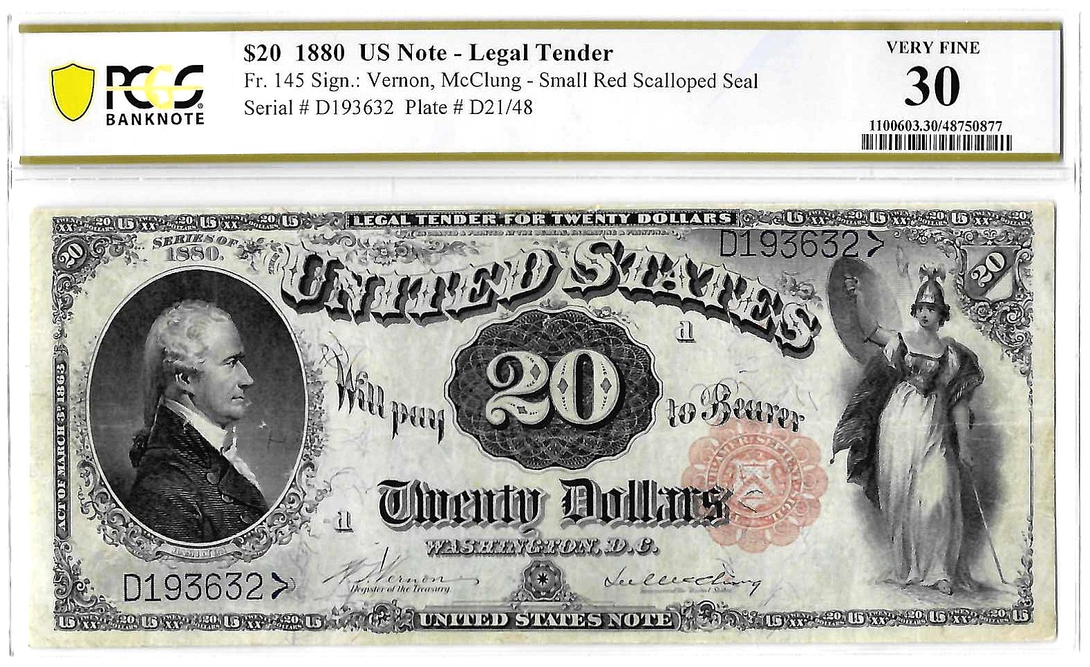 An attractive note with ample margins, solid color, and moderate wear. Plenty of brightness still remains. A better Friedberg number, only 95 notes are known in all grades according to Track & Price. PMG lists just 8 known finer and a single 64 EPQ as the only note they have certified uncirculated.