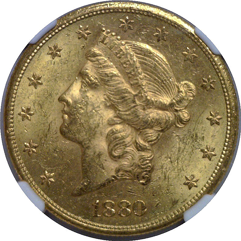 A boldly struck San Francisco double eagle with rich orange-gold color and flashy mint luster.