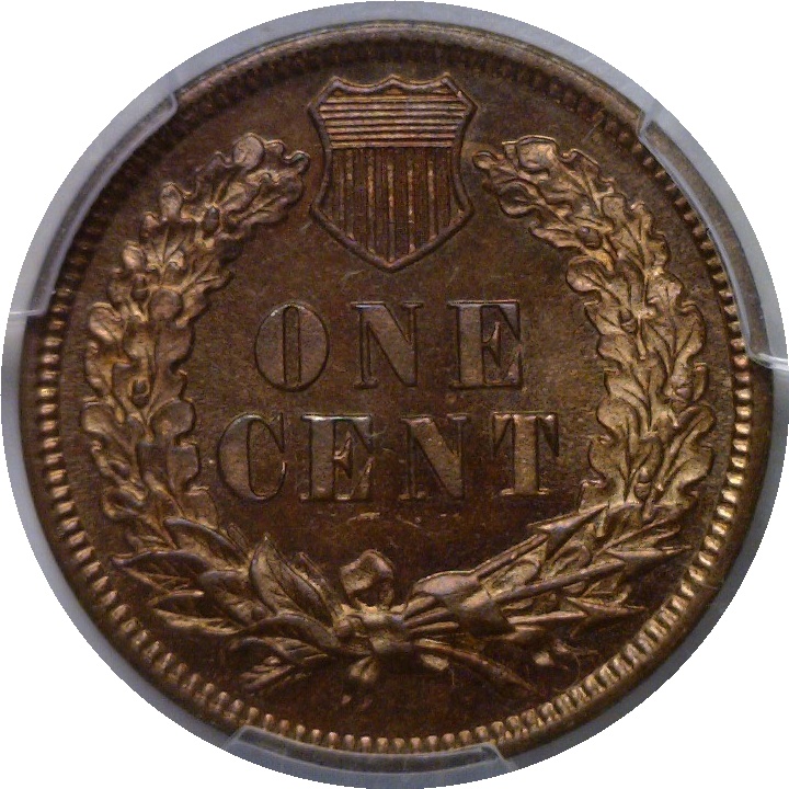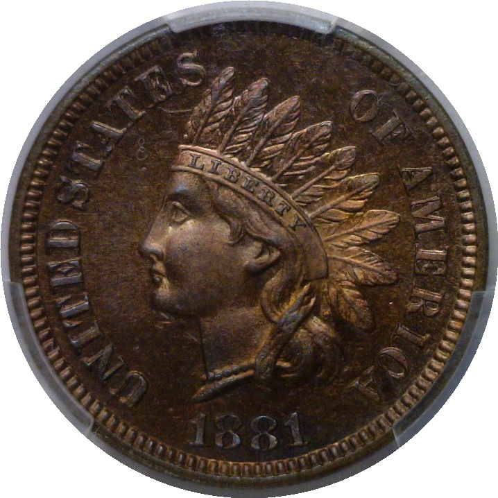 Nearly full red with frosted devices and an iridescent lavender hue. A beautiful proof!