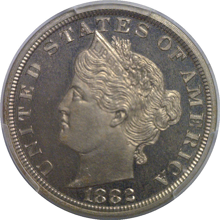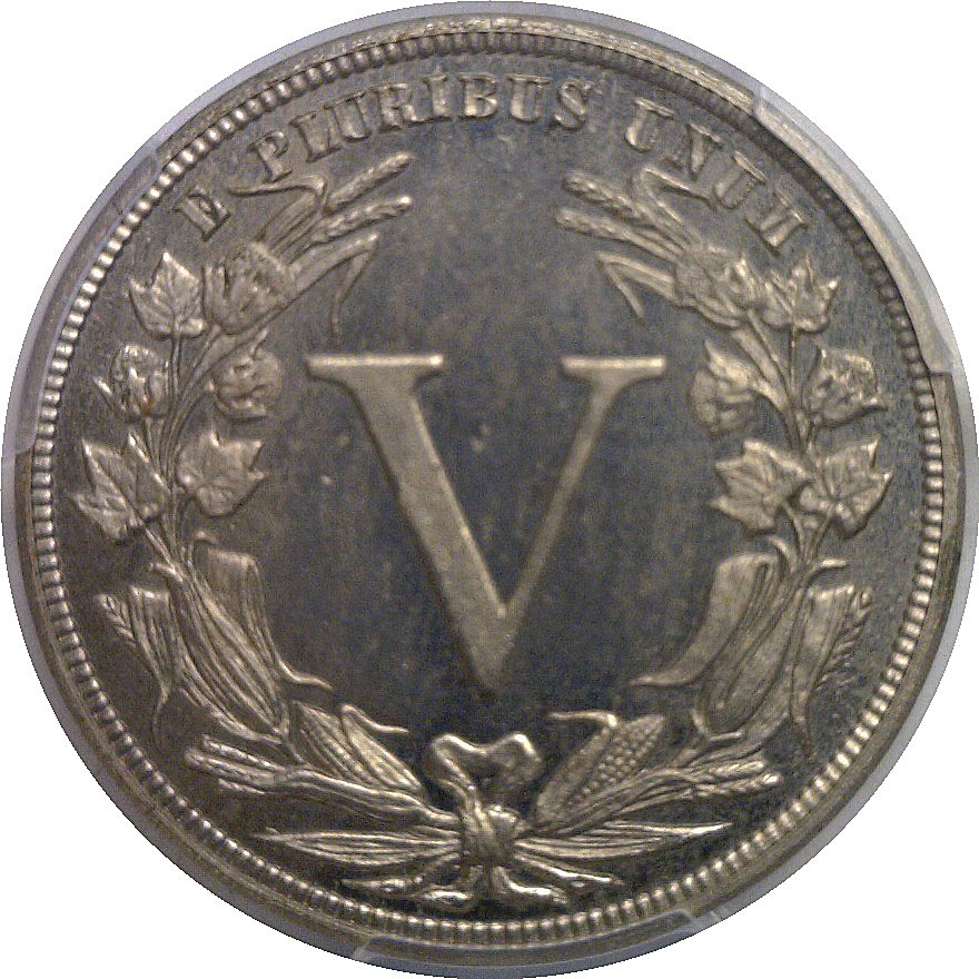 CAC. R-6. Obverse similar to regular issue Liberty Nickel but UNITED STATES OF AMERICA replaces the surrounding stars. A large Roman numeral V within a wreath is on the reverse with E PLURIBUS UNUM above. This is a highly attractive proof showcasing strong cameo contrast and refined design detail. The obverse features Liberty with crisp definition to the hair and coronet, set against deeply reflective fields that contrast nicely with frosted devices. The reverse is equally impressive, with a bold Roman numeral V centered within a sharply detailed wreath, surrounded by mirrored fields of excellent depth and clarity. Surfaces are well preserved for the grade, with only light, unobtrusive hairlines visible under magnification.