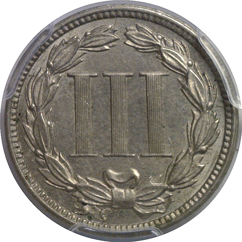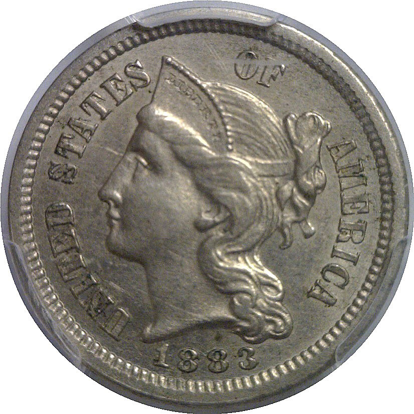 A very scarce date with a mintage of just 4,000 coins, which is actually lower than the proof format mintage in 1883! PCGS estimates that just 200 business strikes survive in all grades, certified and raw. This example offers nearly Mint State quality with crisp detail and only the faintest trace of high-point rub. The obverse displays Liberty’s portrait with strong hair detail and bold lettering, while the reverse wreath and Roman numeral “III” remain sharply defined. The coin’s natural silver-nickel surfaces and pleasing originality add to its appeal.