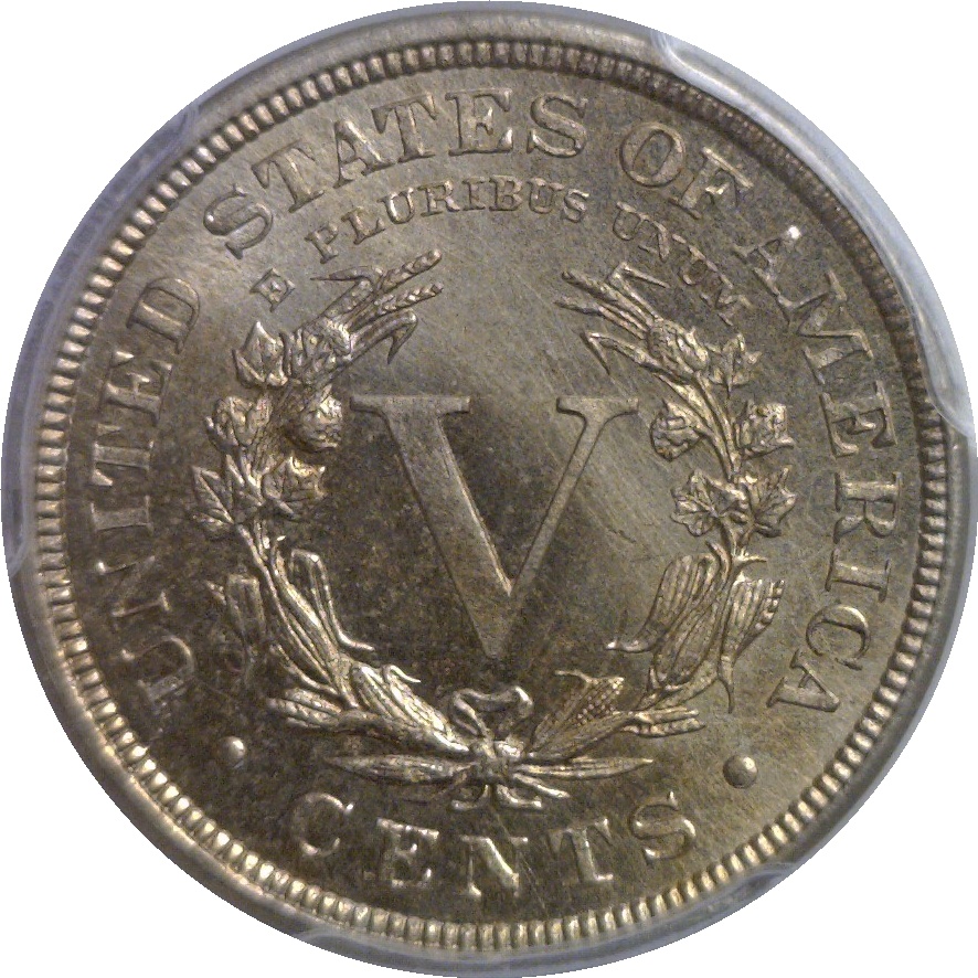 A sharply struck and visually appealing example of this better date ‘V’ Nickel. It displays lustrous surfaces that exhibit smooth, satiny brilliance with crisp star definition and strong detail throughout Liberty’s portrait. The reverse shows well-defined wreath elements and bold central devices, free of distracting marks. A high-grade representative offering both eye appeal and solid technical quality.