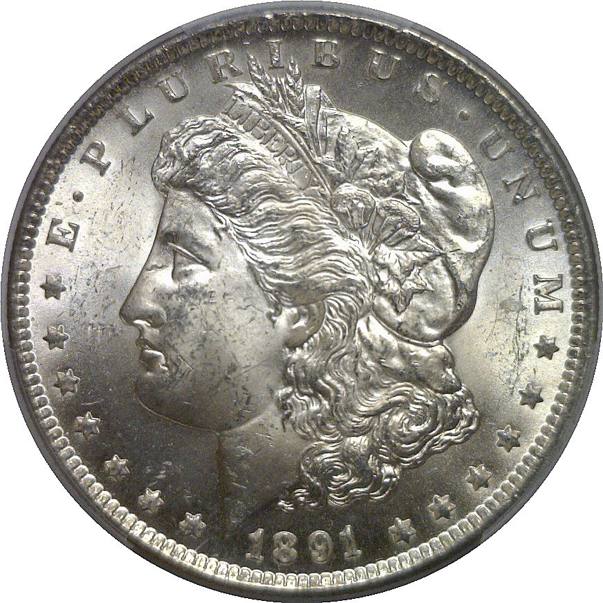 A better date Carson City Morgan, displaying strong luster with attractive silver-gray surfaces and very few light marks, consistent with the grade. Well-defined details throughout Liberty’s portrait and the eagle, with pleasing overall eye appeal.