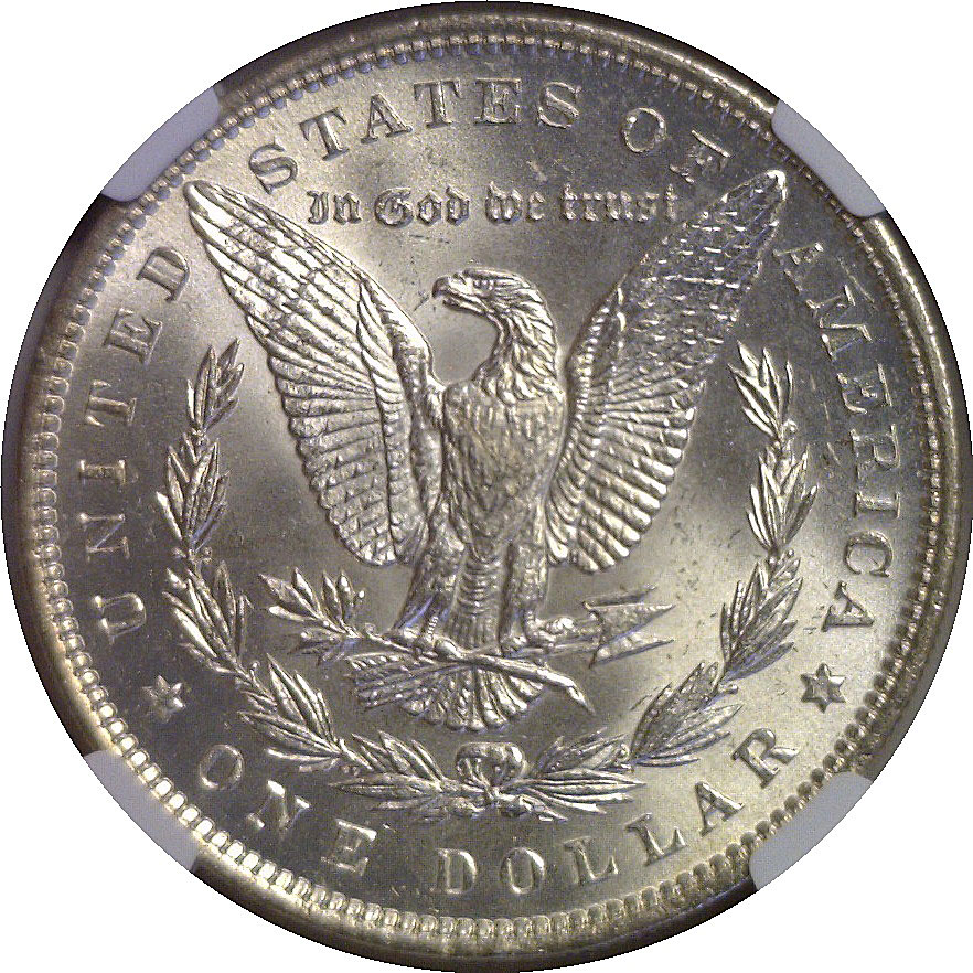 A bright white, lustrous MS63 example of this better-date Morgan, featuring strong cartwheel flash and sharply defined devices. Liberty’s hair and the eagle’s feathers show crisp detail, while the fields remain impressively clean for the grade. A handsome, high-quality piece from a mintage of just 110,000 – the second lowest business strike mintage in the series.