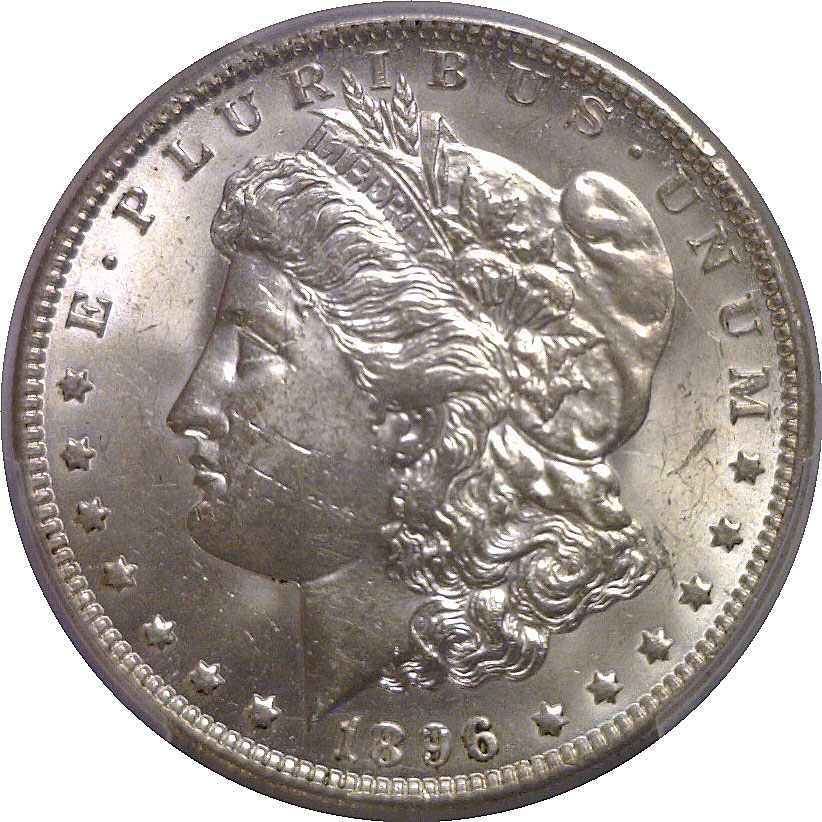 A key conditional rarity in the Morgan Dollar series, the 1896-O is notorious for its poor strike and heavy bag-marks. This example displays satiny luster and above-average detail for the issue, particularly in Liberty’s hair and the eagle’s breast feathers. Light abrasions are present but consistent with the grade, and the coin exhibits strong eye appeal.