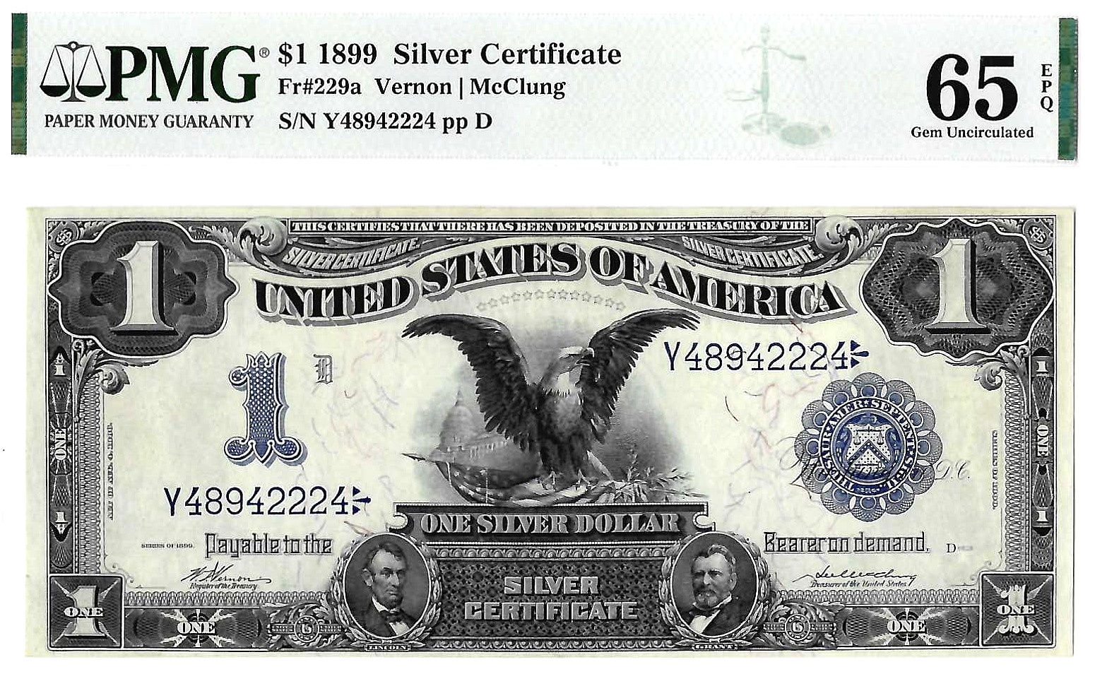 Black Eagle. Fr. 229a was the first issue where the “Series Of 1899” was placed vertically at the right inside frame line and is the scarcest non-star issue in the series. Nice original bright color with vibrant silk fibers. Very tough in any uncirculated grade.