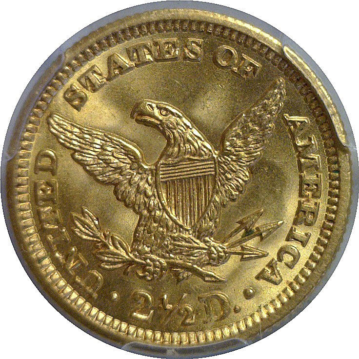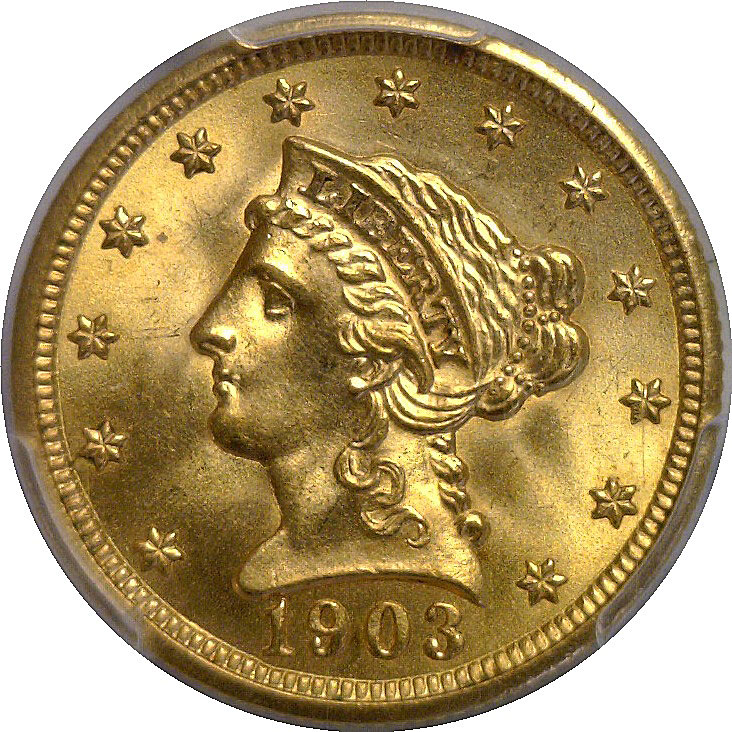 A luminous Gem example with rich yellow-gold surfaces and exceptionally clean fields for the issue. Liberty’s portrait is sharply defined, surrounded by crisp stars and frosty luster, while the reverse eagle displays bold detail and bright, even brilliance. A beautiful MS65 Quarter Eagle with outstanding eye appeal.