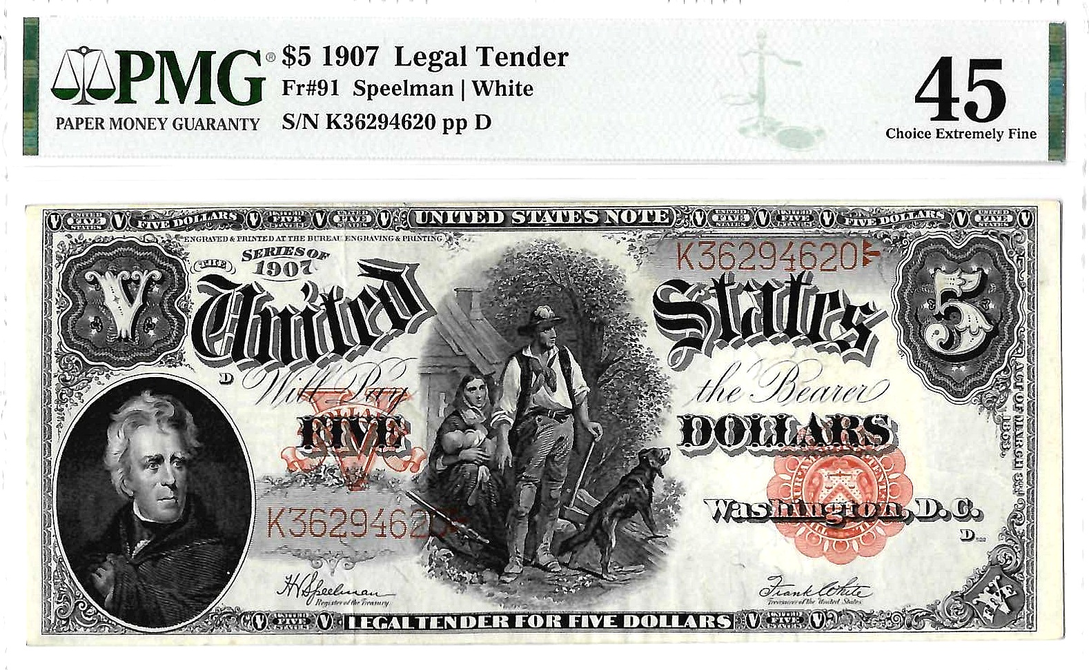 1907 $5 Legal Tender Note Fr-91 PMG XF-45