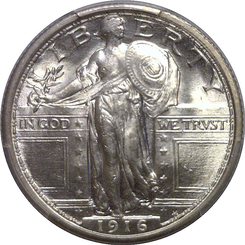 A pleasing example of the iconic first-year Standing Liberty Quarter, struck during the final two weeks of 1916. A classic twentieth century rarity with a mintage of just 52,000. This example displays bright original luster with attractive silver surfaces and solid overall eye appeal. Liberty’s figure is well defined for the issue, with clear shield details and very nearly a Full Head. The reverse shows a bold eagle in flight with strong feather detail and clean fields. Light scattered contact marks, consistent with the grade, do not detract from this coin’s pleasing appearance.