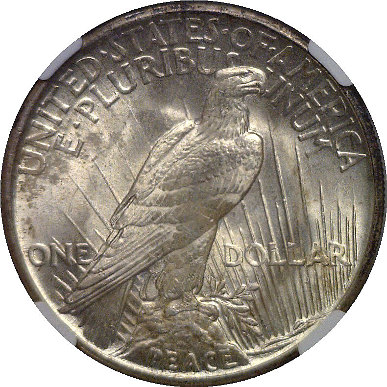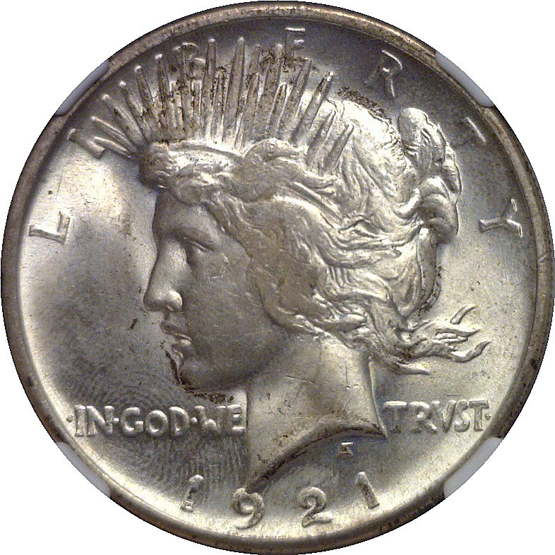 CAC. An iconic first-year Peace Dollar, struck in high relief for only 1921 before the Mint abandoned the design due to production difficulties. This coin offers sharp detail on Liberty’s portrait and the majestic eagle reverse. Frosty luster glows across the surfaces, accented by clean fields and minimal marks for the grade.