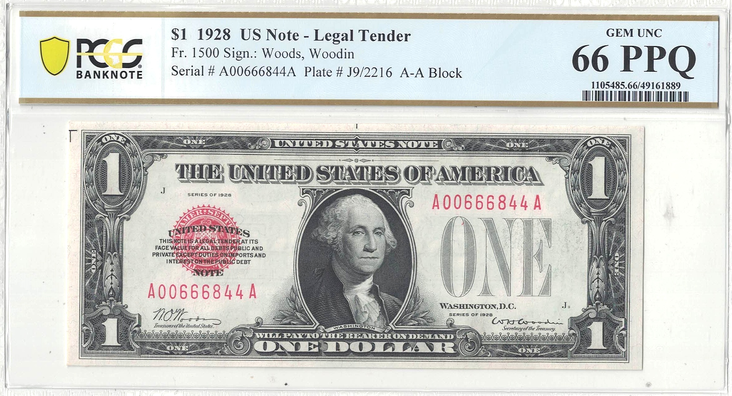 1928 $1 Legal Tender Note Fr-1500 PCGS Gem CU-66 PPQ