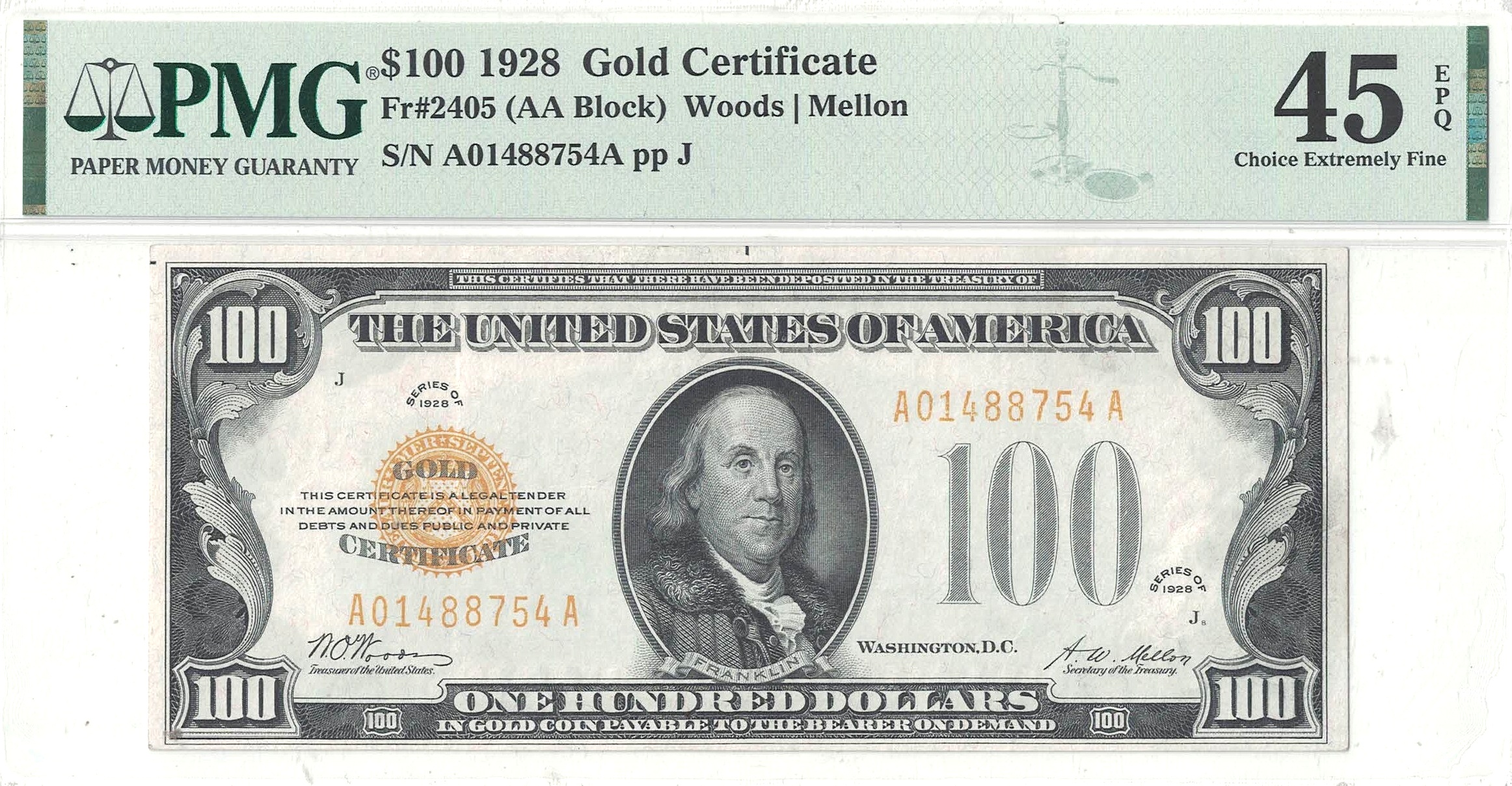 A bright high denomination that exhibits well balanced margins, strong color, and premium paper.