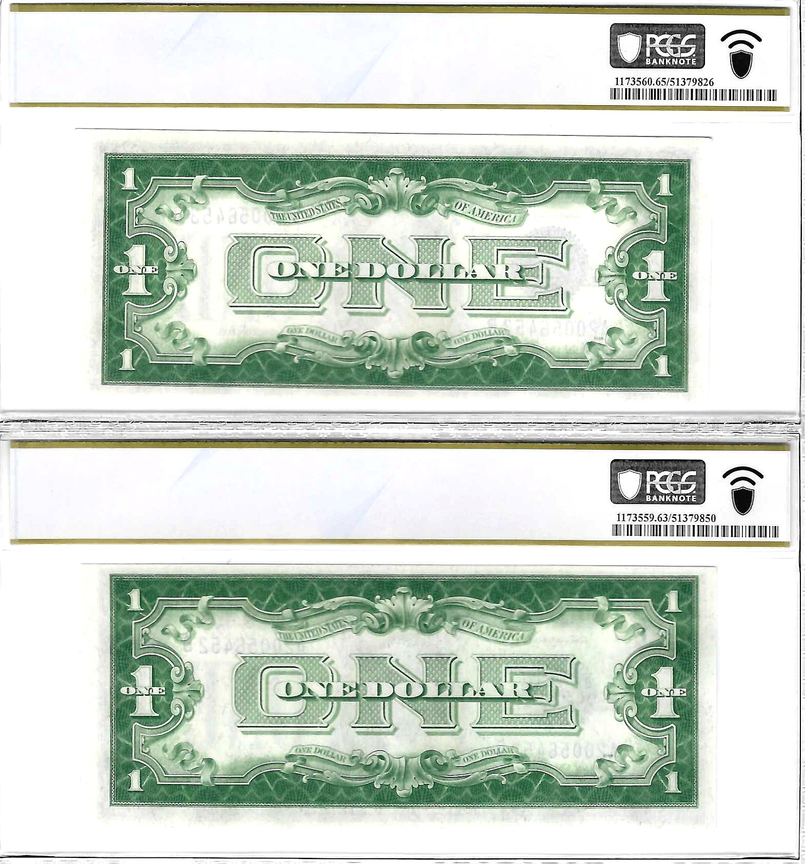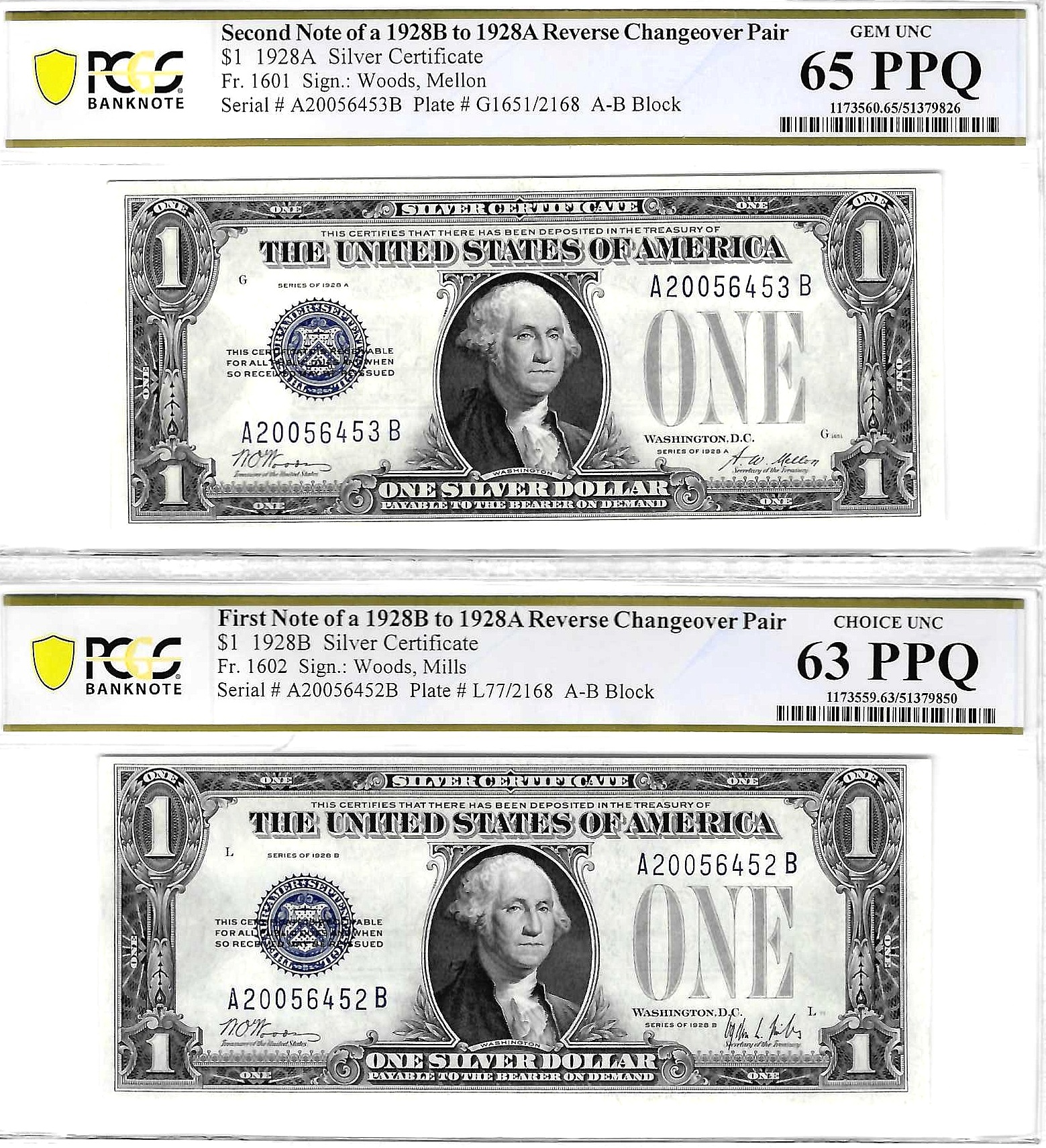 1928-B/1928-A $1 Silver Certificate Fr-1602/1601 Reverse Changeover Pair PCGS Choice CU-63 PPQ/Gem CU-65 PPQ