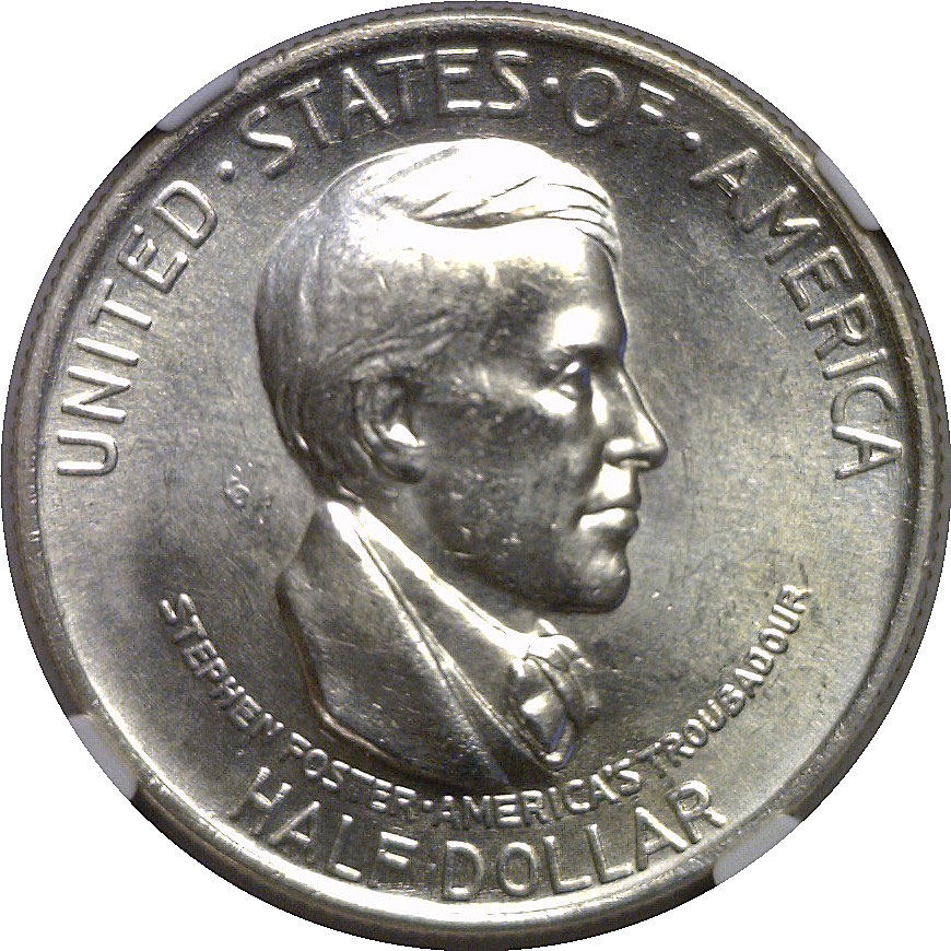 A pleasing near-Gem example with soft, satiny luster and light silver-gray surfaces. Design elements are well-defined, with strong detail on Stephen Foster’s portrait and the allegorical figure on the reverse. A few scattered marks are present, consistent with the grade.