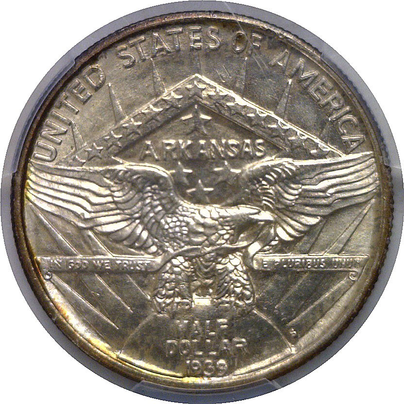 A superbly preserved example of this scarce issue which had one of the lowest mintages of any commemorative at 2,105 coins. The obverse displays conjoined portraits of a Native American chief and a frontier settler, while the reverse features a powerful eagle in flight before a radiating sunburst. This MS67 specimen exhibits sharp definition, smooth satin luster, and attractive light golden toning, with exceptional eye appeal.